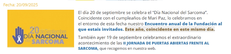 27 de marzo: Reunión Comisión Estable de Trabajo de Oncología Médica - Hospital Vall D´Hebron 31 de marzo: Jornadas de Concienciación de Sarcomas en el CEIP Lorenzo Luzuriaga - En agenda