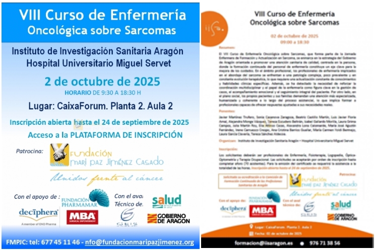2 de octubre: VIII Curso de Enfermería Oncológica sobre Sarcomas. Organiza H. Miguel Servet - Zaragoza.