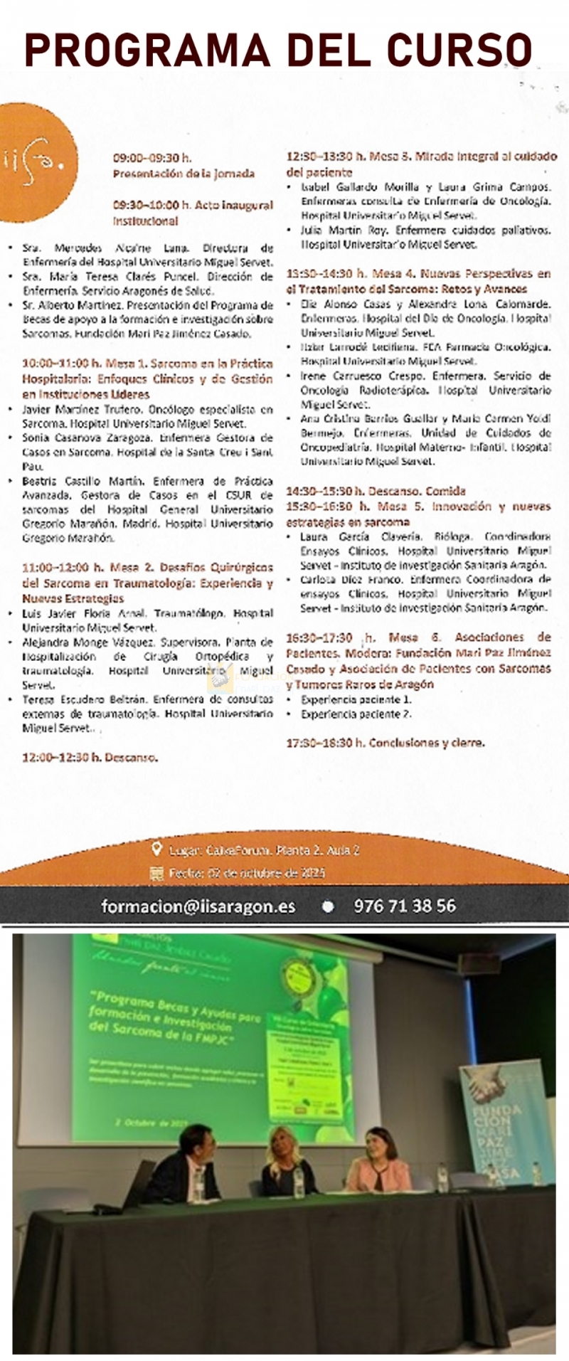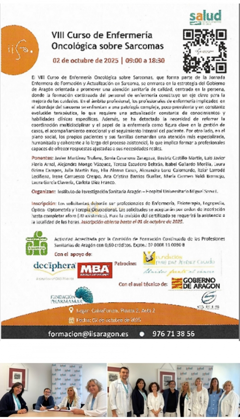 El pasado 2 de octubre del 2025 se celebró el VIII Curso de Enfermería Sarcomas Óseos y de Partes Blandas organizado por Hospital Universitario Miguel Servet y el Instituto de Investigación Sanitaria de Aragón promovido por la Fundación Mari Paz Jiménez Casado.