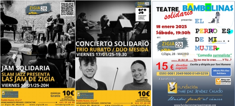 10 de enero:Concierto Solidario Las Jam de Zigia 17 de enero: Concierto Solidario Trio Rubato / Duo Mesida 18 de enero:Teatro Solidario Bambolinas