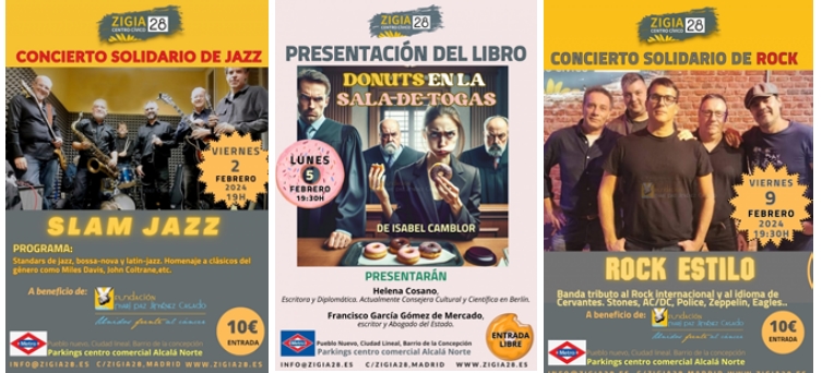 2 de febrero: Concierto Solidario - Zigia,28 6 de febrero: Presentación del libro "Donuts en la sala de togas" de Isabel Camblor. Recaudación donada a FMPJC 9 de febrero: Concierto Solidario - Zigia,28