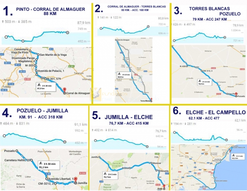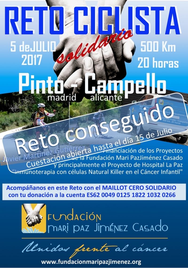 Nuestro vicepresidente y patrono Javier Martínez Gutiérrez, recordando los 40 años del comienzo de su relación con Mari Paz y uniéndolo con su pasión por la bicicleta, se propuso afrontar el reto de recorrer 500 km comenzando en Pinto (Madrid) para finalizar en Campello (Alicante). 20 horas de rodaje en continuo con las mínimas paradas para avituallamiento y refresco.