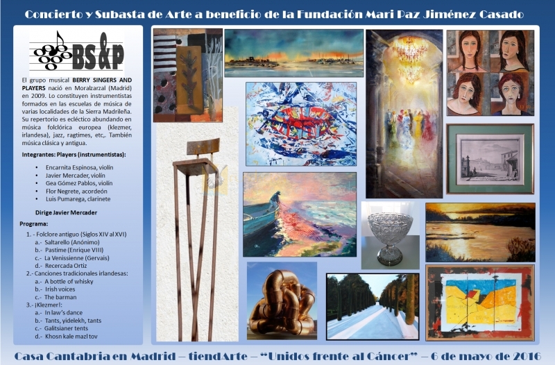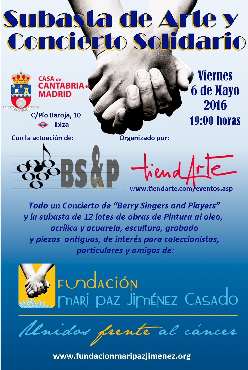 Este acto organizado por tiendArte, amigos de la Fundación, tendrá lugar en Casa Cantabria en Madrid que nos ofrece su Salón de Actos. Un excelente escenario que compartiremos con el Grupo Musical Berry Singer and Players en Concierto y nuestra Subasta Solidaria de Arte.