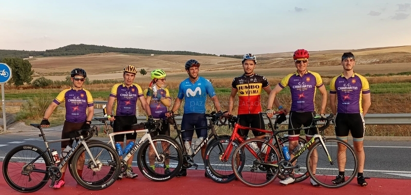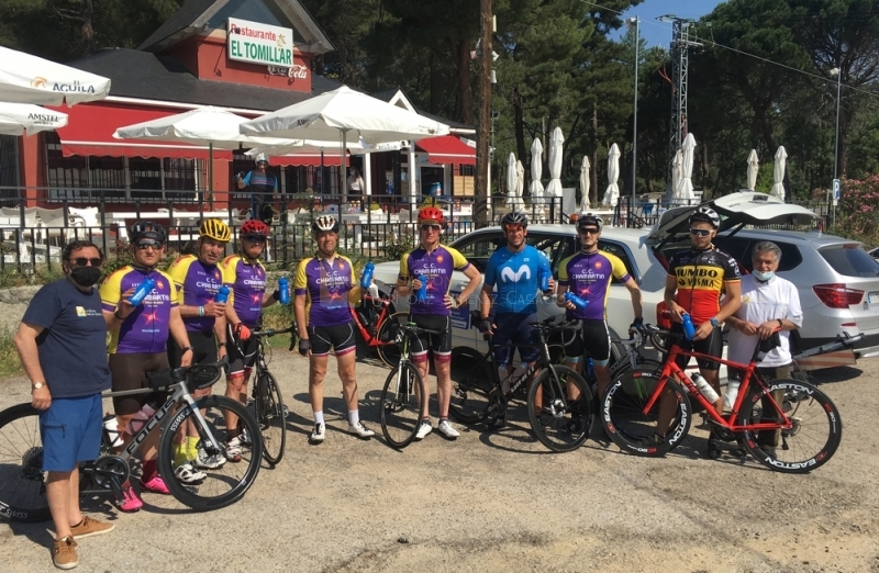 La siguiente parada nos esperaba en San Lorenzo del Escorial, recorriendo el puerto de la Morcuera y pasando por Miraflores de la Sierra. En Soto del Real se incorporaron a la marcha Manuel Salinas y Luis Miguel Lorenzo para esta etapa y ya en San Lorenzo se incorporaron Felipe Campos, Javier Miró y David Martínez. La temperatura ya no era la de por la noche y la escalada por el Puerto de la Cruz Verde y la etapa hasta Villamantilla, se hizo bajo un sol y temperatura implacables. El entusiasmo y también el cansancio aumentaba. Jesús Gurría, un clásico en nuestros retos se incorporaba a la marcha. Rachas de viento y el calor que no cesaba hasta Titulcia pasando por Navalcarnero y Ciempozuelos. Nuevo descanso atisbando los últimos 80 km hasta Madrid.