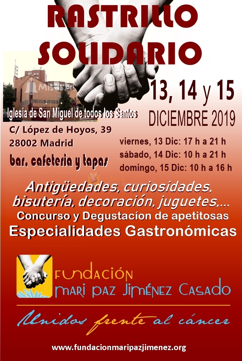 La Parroquia de San Miguel de todos los Santos en la calle López de Hoyos, 39, 28002 Madrid, acogerá este año nuestro tradicional Rastrillo que celebraremos hoy viernes día 13 de Diciembre, mañana sábado, 14 y el domingo 16.
